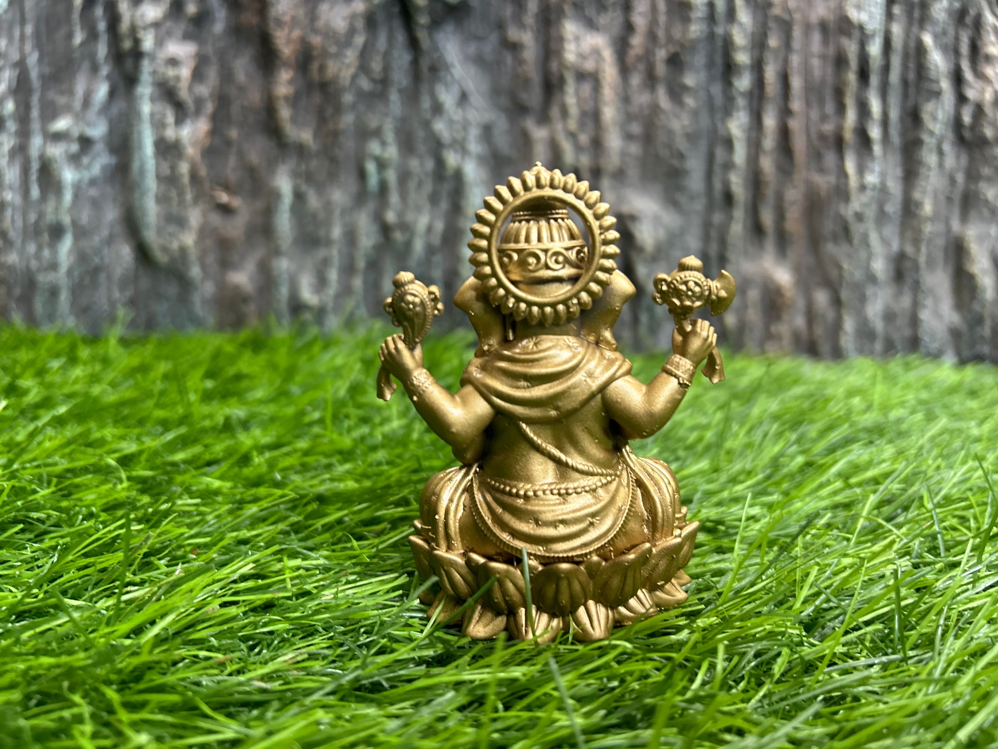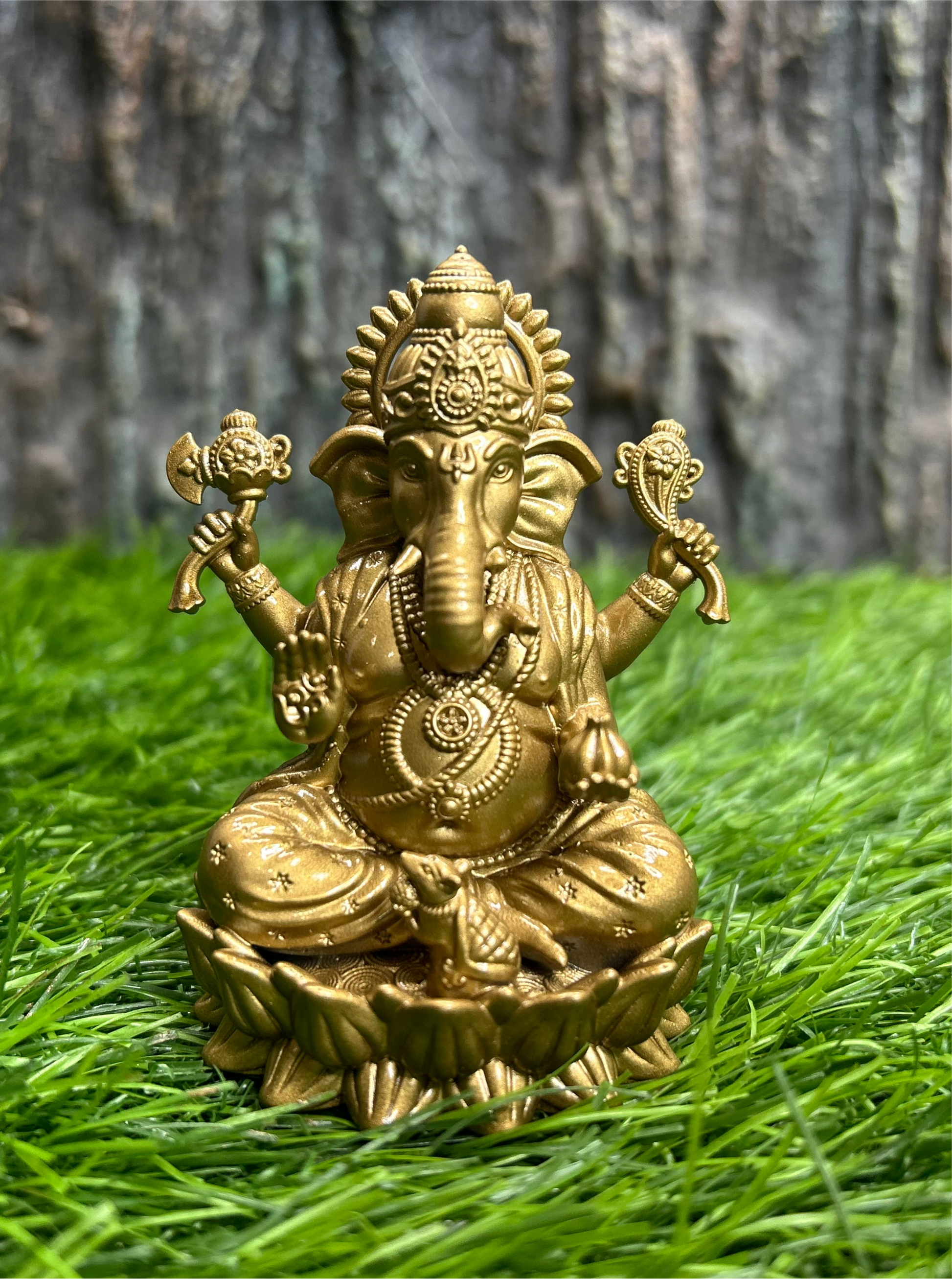 This 3inch Ganesha figurine sits atop a beautifully crafted lotus flower. Ganesha, the Hindu deity known as the remover of obstacles, symbolizes success, wisdom, and luck. The lotus, a symbol of purity and enlightenment, adds a peaceful touch to any space. Display for positive energy and blessings.