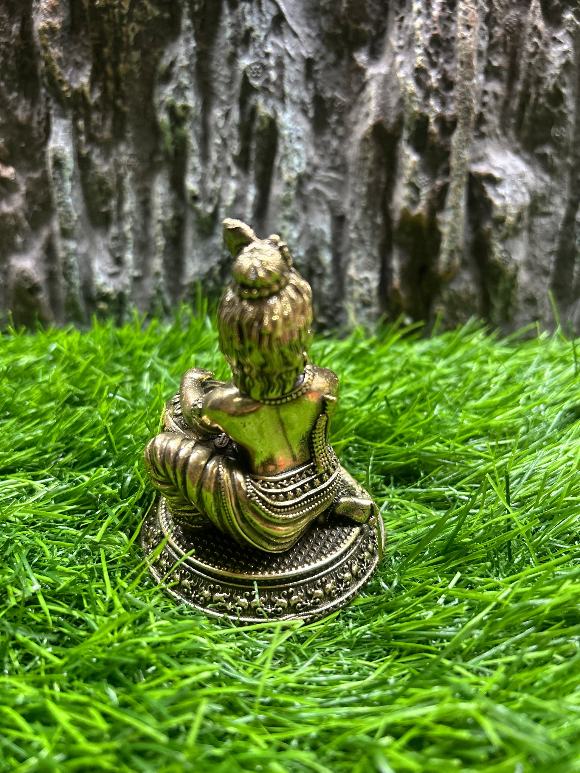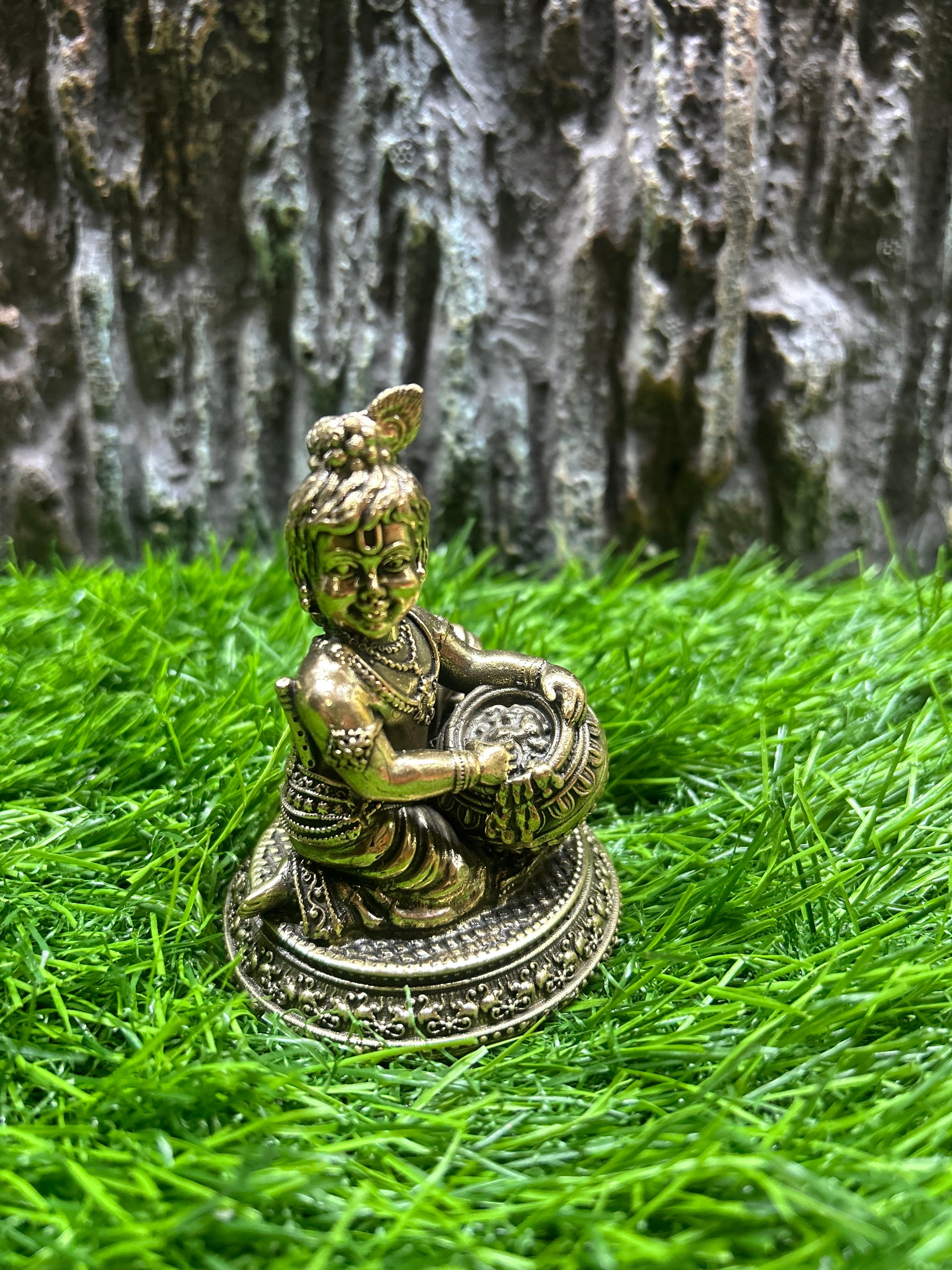 Makhana Krishna Brass Idol – Beautifully crafted in pure brass, this charming idol depicts Lord Krishna in a playful pose holding a pot of makhan (butter), symbolizing innocence, joy, and divine love. The intricate detailing captures His mischievous childhood form, also known as Makhan Chor. Perfect for home temples, pooja rooms, or as a heartfelt gift, this idol is believed to bring happiness, prosperity, and devotion into the home. Its antique finish enhances its spiritual and decorative appeal.