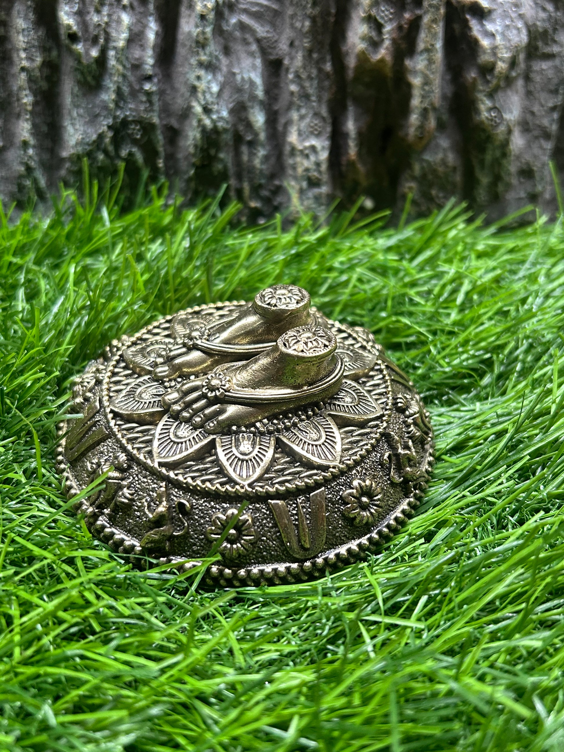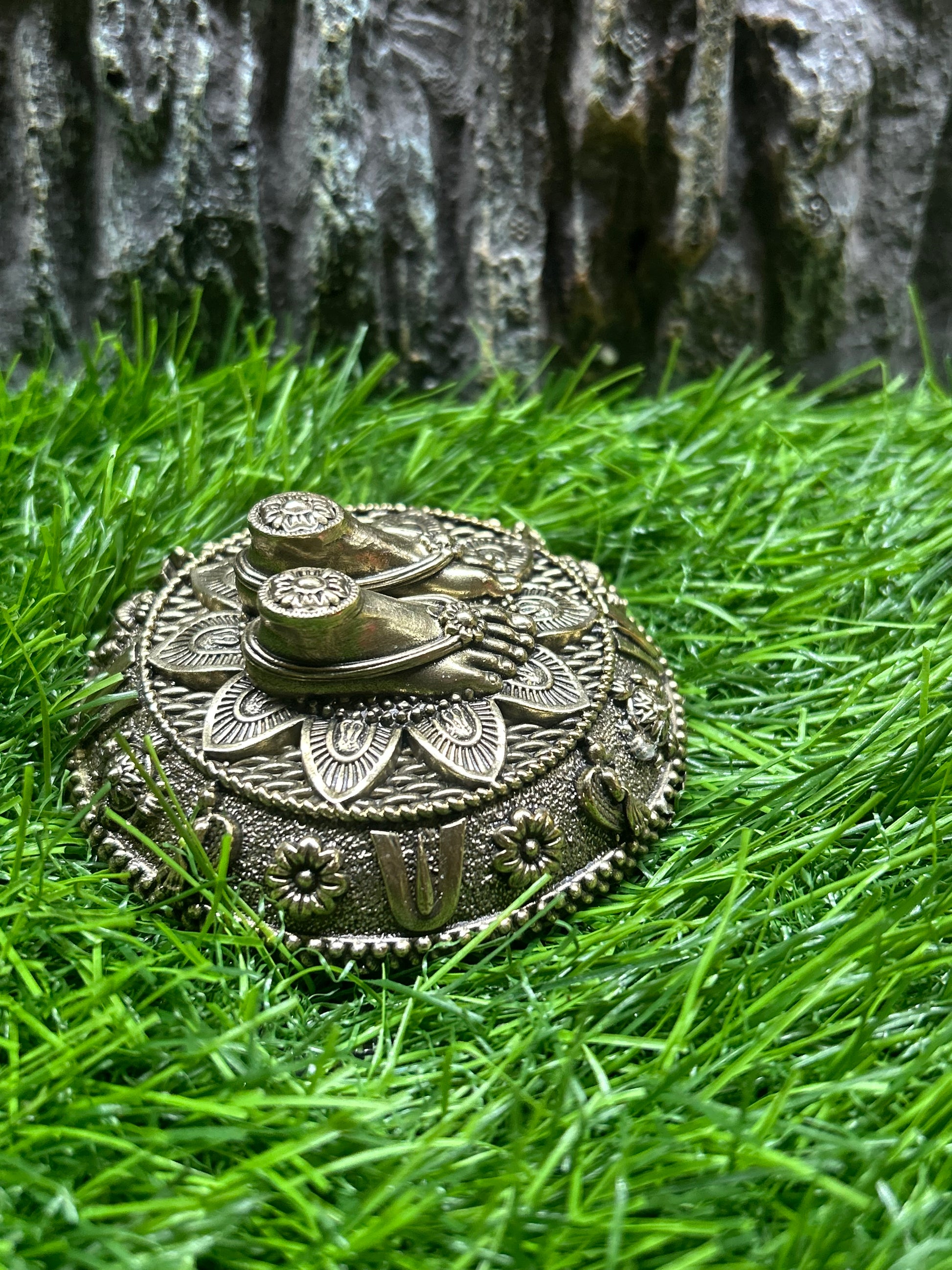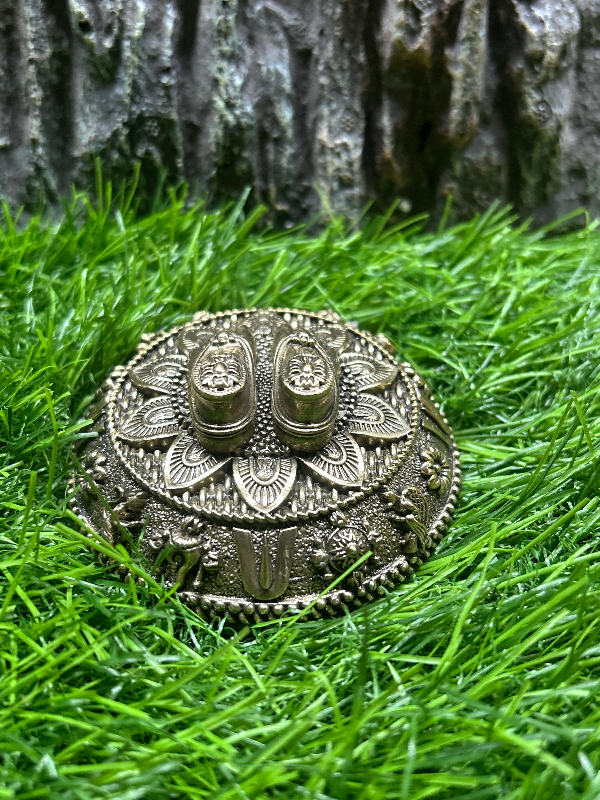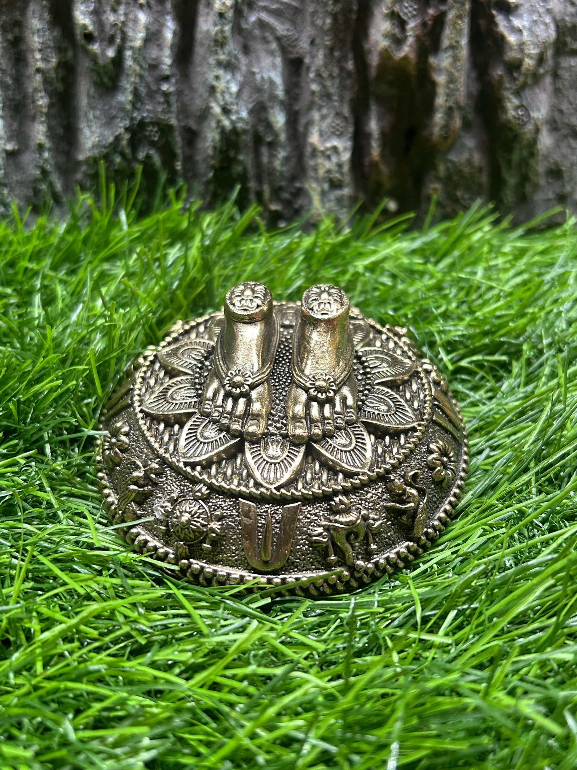 Tirupati Balaji Brass Feet Idol – Crafted with devotion from pure brass, this sacred piece depicts the divine feet (Paadam) of Lord Venkateswara of Tirumala. It is believed that worshipping the holy feet brings blessings of prosperity, peace, and spiritual upliftment. Perfect for home temples, pooja rooms, or as a spiritual gift, this idol carries intricate detailing that reflects timeless artistry. Place it on your altar to invite the grace and blessings of Lord Balaji into your home.